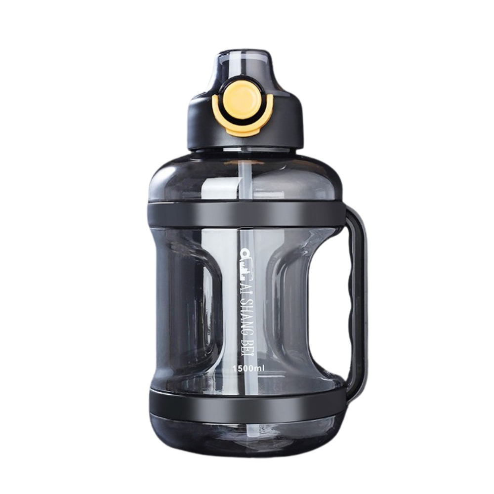 Спортивная бутылка для воды объемом 1500 мл - изготовленная из ударопрочного пластика, за счет чего позволяет продлить использование и быть универсальной как в домашних условиях, так и на тренировках, в зале, дороге.