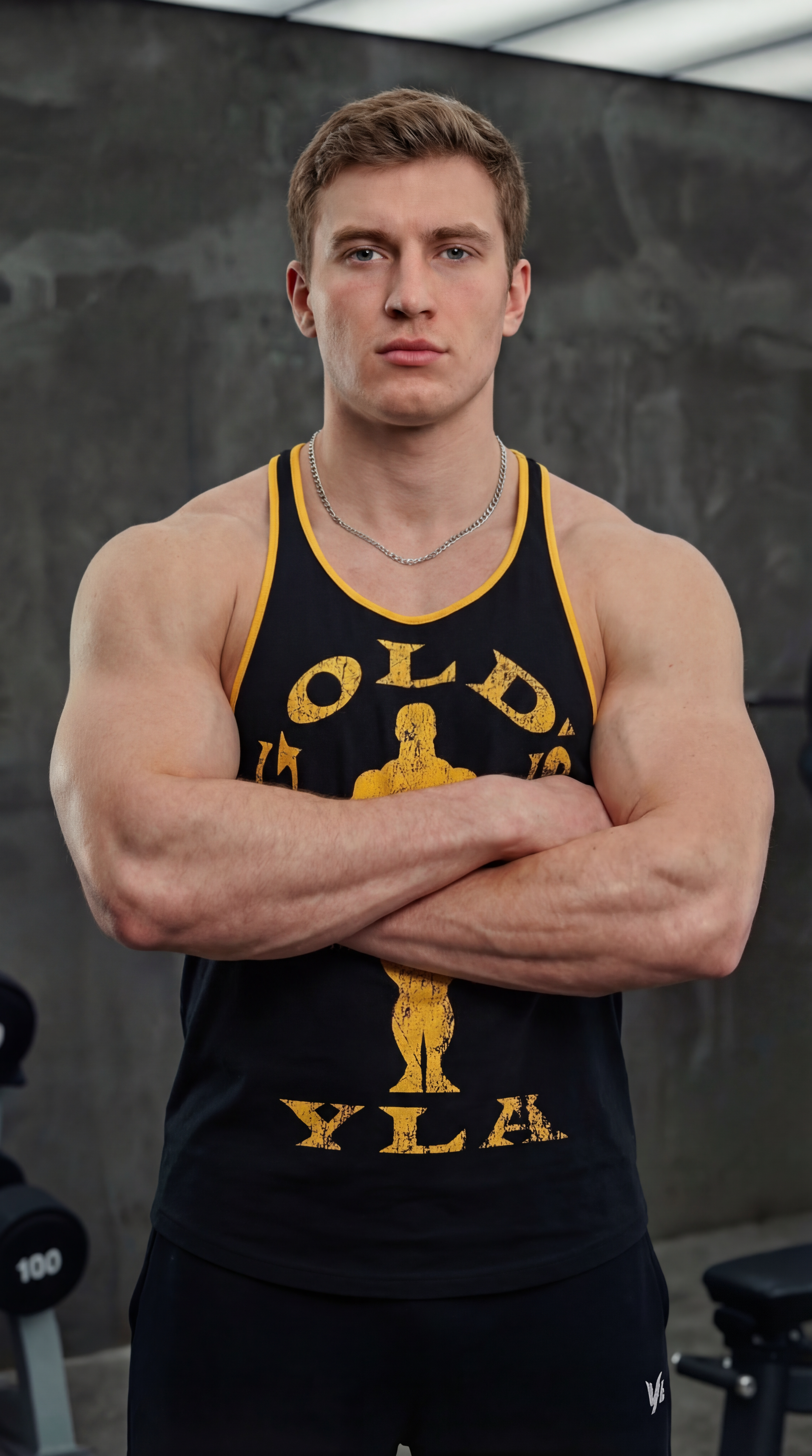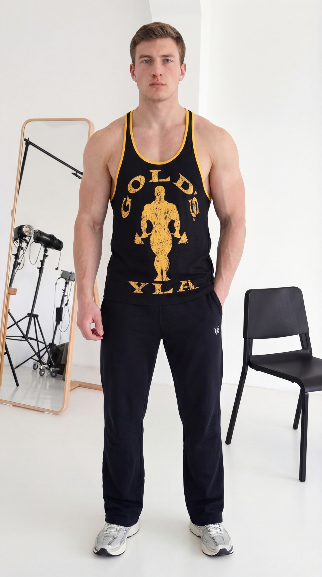 Майка черная с желтыми буквами GOLDS YLA XL